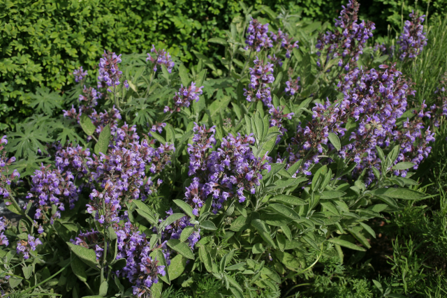 An evergreen, highly aromatic, shrubby perennial, growing to 60cm (2ft) it has downy, roughly-textured, hairy, grey-green, ovate leaves to 8cm long and spikes of tubular, violet-blue flowers in early summer. A popular culinary herb. 80cm high by 1m wide. Winter hardy. Mediterranean and N. Africa. Introduced in cool temperate regions. Prune in spring or just after flowering but avoid cutting into old wood. After a few years, Salvia officinalis become straggly and need replacing.