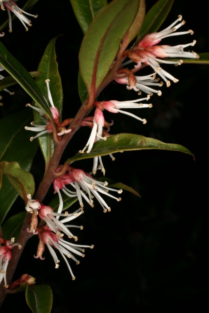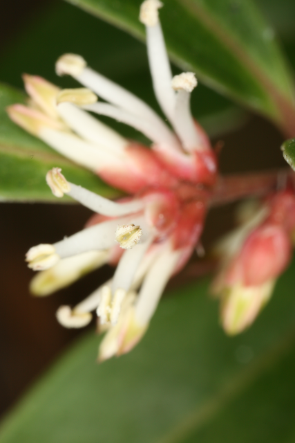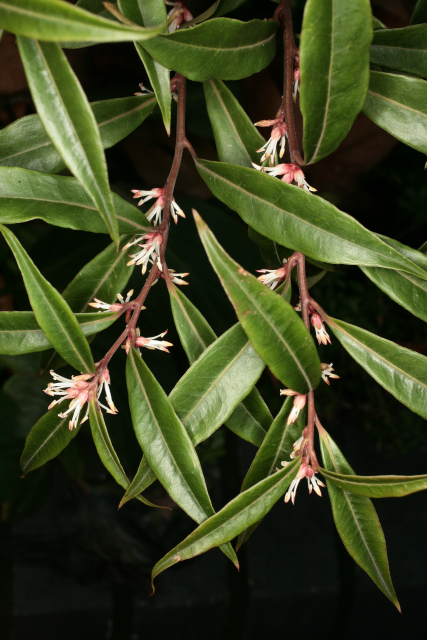 Sarcococca hookeriana Baill. Buxaceae var digyna. This variety has the RHS Award of Garden Merit. Himalayan Sweet Box. Distribution: China to Himalayas. Sarcoccoca means flesh fruit; hookeriana pertains to one of the Hooker's, Directors of the Botanic Garden, Kew - but could be either the father or the son; digyna may be from the Linnaean order of plants, Digynia, meaning 'with two styles' (the stalks that connect the stigma to the ovary). Steroidal alkaloids have been found in the plant which have antileishmaniasis activity in vitro.