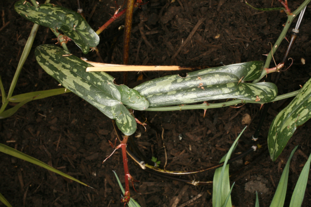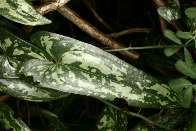 NOTES ON THE GENUS: Smilax is a genus of some 300-350 species that grow in many parts of the world from temperate to tropical zones. Some species, e.g. Smilax officinalis originate from Central and northern South America (Green, 1824; Flückiger and Hanbury, 1874) and others, notably S china and S glabra ,from SE Asia. There are about 80 species in China, many used in Traditional Chinese Medicine [Zhongzhen, 2004; Winterbottom, 2015], probably a similar number in India and about 20 in North America; the more important species commercially and medically have included S. china, S. glabra, S. officinalis and S. syphilitica. The native Jamaican variety is S. regelli and that name has also been indiscriminately applied to many North American species. The commonest species growing wild in Europe appears to be S. aspera, which, although not the most favoured for this purpose, has been used to make Sarsaparilla drinks that are more conventionally prepared from the root of S. regelli and other species. They are perennial, woody climbers, usually with thorny stems, that may form dense thickets up to 10m high. The leaves, up to 30cm long, may be streaked with white patches, the flowers range from white to pink or green and the berries are dark red.