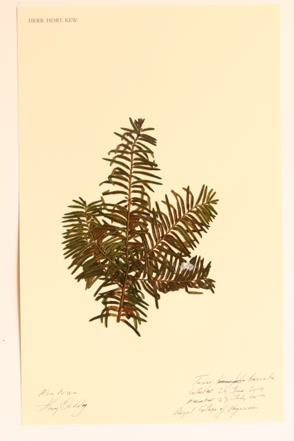 Trees are feminine in Latin, so while Taxus has a masculine ending (-us), its specific name, baccata, agrees with it in gender by having a female ending (-a). In Latin, baccata means 'having fruits with a pulpy texture.'