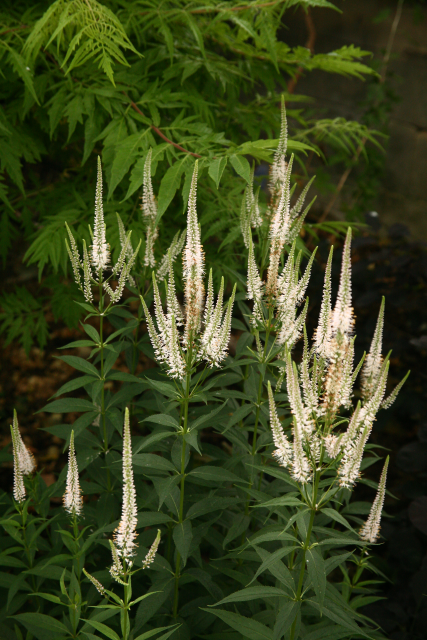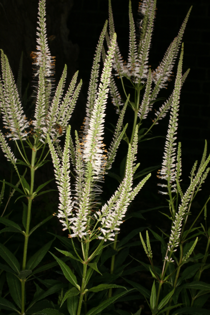 The following notes apply to the species of this plant: Veronicastrum virginicum (L.)Farw. Scrophulariaceae Cultivar 'Pink Glow'. Known as Blackroot or Culver's Root. Distribution: North America. Austin (2004) calls it Black-root, also known by its synonym Leptandra virginica. He reports that it was used by Native Americans as a purgative and antiseptic, sudorific [to induce sweating], tonic, and that the Cherokee chewed the plant to relieve colic and made it into a tea for backache. The Menomini used it as an emetic, and for purification after being 'defiled' by being touched by a bereaved person. It was used for constipation, kidney stones, ague, to aid weak women and for labour by the Meskwaki. The crushed root was used as cathartic, and to clean scrofula (tuberculous) sores, by the Ojibwa and the Seneca. Root bitter and nauseous. Stearns (1801) advises that one teaspoon of 'Culver's root' would induce vomiting, which indicates how toxic it is. The medicine is said to gain its popular name from Dr Culver about whom nothing appears to be known. Oliver Wendell Holmes relates in his Medical Essays (1842-1882, p. 152, The Medical Profession in Massachusetts) about Cotton Mather, the early 18th century Calvinist at the heart of the Salem witchcraft trials, writing to John Winthrop of New London in 1716 who ' speaks of it [Culver's Root] as famous for the cure of consumption [tuberculosis], and wishes to get some of it, ... for his daughter Katherine, his eldest daughter. He gets it and gives it to the 'poor damsel' ... who dies the next month, - all the sooner, I have little doubt, for this uncertain and violent drug ...' (referencing the Mather Papers in Hist. Coll. 4th Series, viii:420).