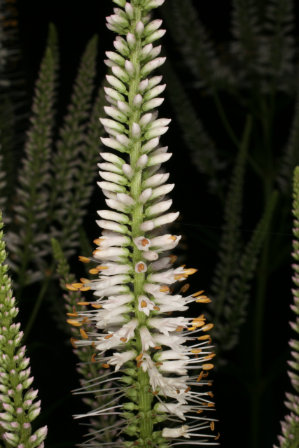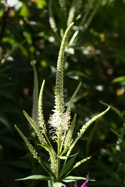 Veronicastrum virginicum (L.)Farw. Scrophulariaceae Cultivar 'Pink Glow'. Known as Blackroot or Culver's Root. Distribution: North America. Austin (2004) calls it Black-root, also known by its synonym Leptandra virginica. He reports that it was used by Native Americans as a purgative and antiseptic, sudorific [to induce sweating], tonic, and that the Cherokee chewed the plant to relieve colic and made it into a tea for backache. The Menomini used it as an emetic, and for purification after being 'defiled' by being touched by a bereaved person. It was used for constipation, kidney stones, ague, to aid weak women and for labour by the Meskwaki. The crushed root was used as cathartic, and to clean scrofula (tuberculous) sores, by the Ojibwa and the Seneca. Root bitter and nauseous. Stearns (1801) advises that one teaspoon of 'Culver's root' would induce vomiting, which indicates how toxic it is. The medicine is said to gain its popular name from Dr Culver about whom nothing appears to be known. Oliver Wendell Holmes relates in his Medical Essays (1842-1882, p. 152, The Medical Profession in Massachusetts) about Cotton Mather, the early 18th century Calvinist at the heart of the Salem witchcraft trials, writing to John Winthrop of New London in 1716 who ' speaks of it [Culver's Root] as famous for the cure of consumption [tuberculosis], and wishes to get some of it, ... for his daughter Katherine, his eldest daughter. He gets it and gives it to the 'poor damsel' ... who dies the next month, - all the sooner, I have little doubt, for this uncertain and violent drug ...' (referencing the Mather Papers in Hist. Coll. 4th Series, viii:420).