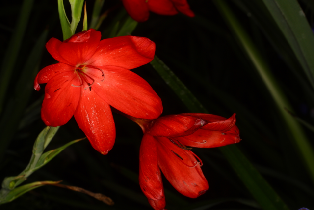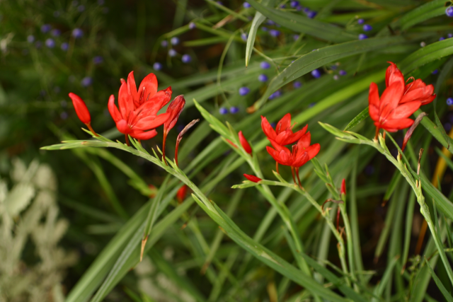 Hesperantha coccinea (Backh. & Harv.) Goldblatt & J.C. Manning 'Major' the best red flowered form. Previously called Schizostylis coccinea, Iridaceae. African or Kaffir lily. Tuberous perennial Distribution Zimbabwe to South Africa. Schizostylis is Greek for 'divided style' - the style is in three parts; coccinea means 'red'. Hesperantha is Greek for 'evening flower' as the flowers open late in the day. No medicinal use.