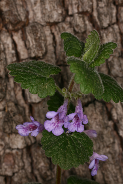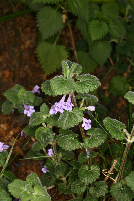 Glechoma is derived from Glechon, Greek for a type of Mint, as the leaves resemble plants in the genus Mentha. Hederacea alluding to Ivy, genus Hedera. Hence the name Ground Ivy.