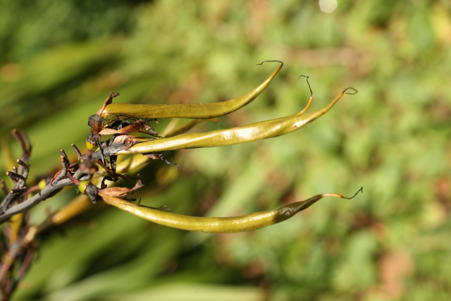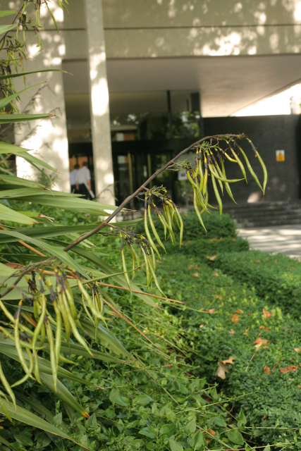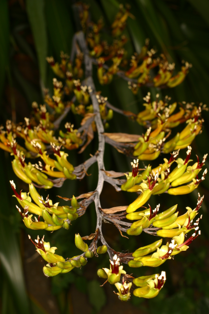 Previously identified as Phormium tenax, a visitor recognised it by its yellow green flowers and pendulous twisted seed pods as being Phormium cookianum. Phormium tenax has red flowers and upright seed pods. However Kew have recently changed the name on the basis of priority to Phormium colensoi (named after the Rev. William Colenso printer to the Missionary Society who helped J D Hooker with his flora of New Zealand) as this name was validly published (but overlooked) on January 1 1848, and it was only given the name Phormium cookianum (named for Captain Cook) a few months later in the same year. Ours appears to be the lowland form from North Island with yellow-green tepals whereas the mountain form from South Island has red tepals