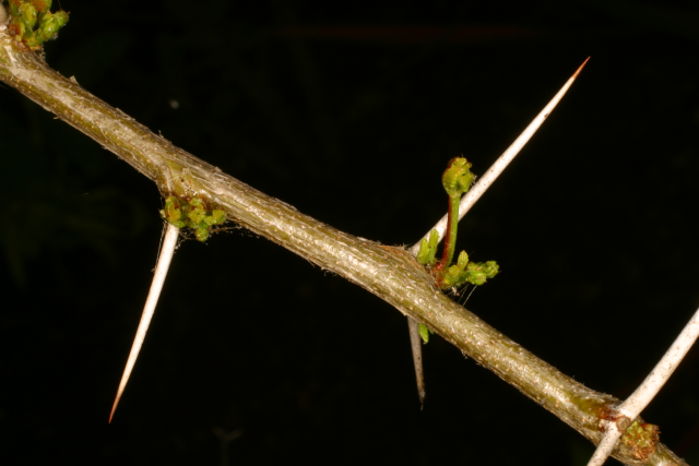 Acacia karroo Hayne – Sweet-thorn; Karoo thorn. Small tree. Distribution Southern Angola, east to Mozambique, south to South Africa. This tree is festooned with fearsome thorns, and, just before the rainy season starts, it produces poisonous sap; the slightest graze from a thorn at this time causes swelling and pain for several days. The bush people of the northeast district of Namibia use its sap in an arrow poison, adding it to the larva of Diamphidia – which is also poisonous. Its active ingredients are cyanogenic glycosides – which produce cyanide on hydrolysis. The bark contains tannins, which have been implicated in carcinogenesis. Acacia karoo produces Cape Gum, which is used in pharmaceutical preparations and to treat diarrhoea. Used to make rope from the bark, gum to make candy, fodder for animals, charcoal.
