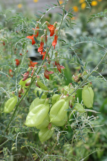 Evergreen shrub with slender, erect, twiggy, white-downy stems and pinnate hairy, grey-green leaves, 6-10cm long, each with 13-21 small, oblong to linear-elliptic leaflets on densely white-downy midribs. From late spring to summer, bears racemes, to 8cm long, of pea-like, bright red flowers, 2.5-5cm long. Followed by inflated, broadly ellipsoid to almost spherical, greenish yellow, occasionally red-flushed seed pods, to 5cm long.