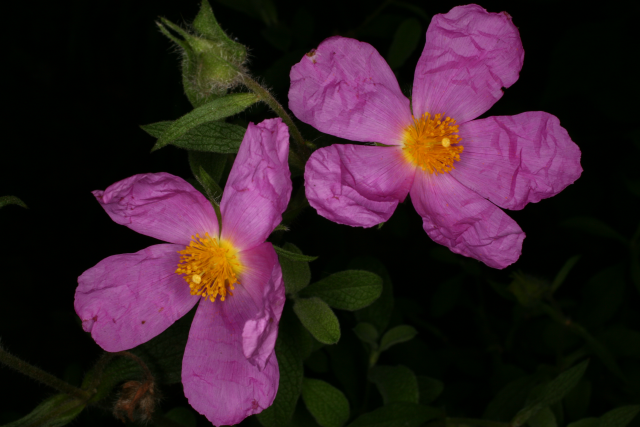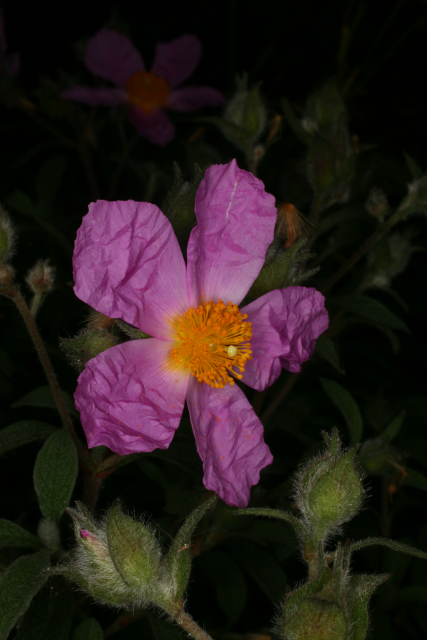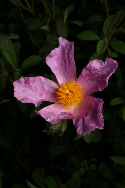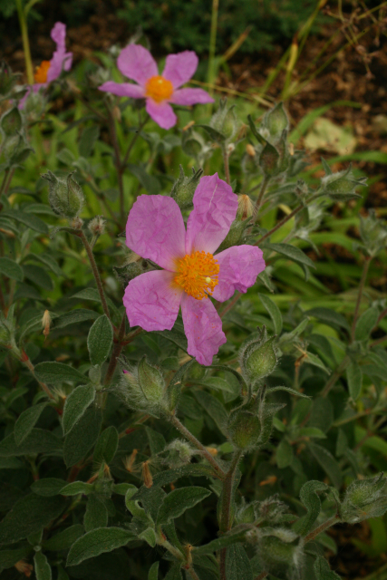 Cistus incanus ssp creticus Juss. Cistaceae. Rock Rose. Distribution: Crete. Interesting symbiosis with fungus called Tuber melanosporum which increases nutrient absorption for the plant and inhibits growth of other plants in the vicinity. It is a source of the resin ‘labdanum’ (a.k.a. ‘ladanum’) used in perfumes (similar smell to ambergris), as is Cistus ladanifer. It has no medical uses now, and such use was dwindling even in the 18th century. In the 16th century (Henry Lyte’s 1575 translation of Rembert Dodoen’s Cruydeboeck of 1554) its uses were described (directly copied from Dioscorides’ Materia Medica (70AD)) as: ‘Ladanum dronketh with olde wine, stoppeth the laske [periods], and provoketh urine. It is very good against the hardness of the matrix or mother [uterus] layde to in the manner of a pessarie, and it draweth down the secondes or afterbirth, when it is layde upon quicke coles [hot coals], and the fumigation or parfume thereof be received up into the body of women. // The same applied to the head with Myrrhe and oyle of Myrrhe, cureth the scurffe, called Alopecia, and keepeth the heare [hair] from falling of [sic], but whereas it is already fallen away, it will not cause the heare to growe agayne. // ...' and goes on in this vein about its uses for pain in the ears, and removing sores and scars and other things.