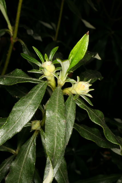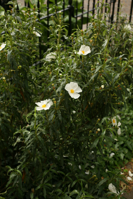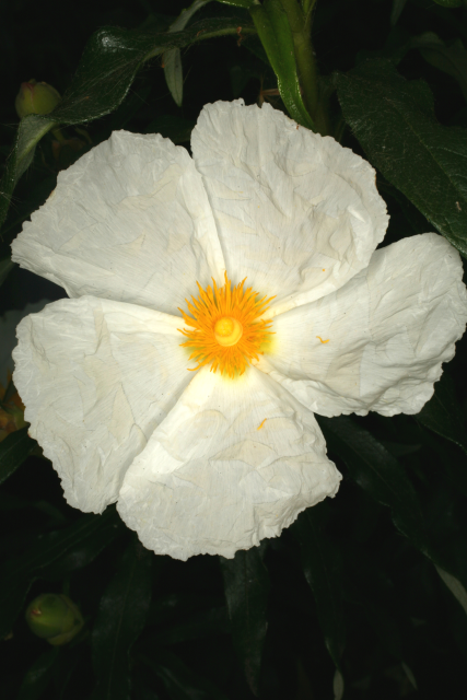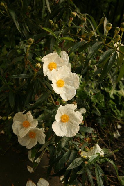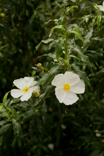 Cistus ladanifer L., Cistaceae. Common Gum Cistus or Ladanum/labdanum. Distribution: Southern Europe and N. Africa. The fragrant resin from the sticky leaves, Gum Labdanum, is extracted and used in Mediterranean regions as an insecticide and deodorant ((Lewis & Elvin-Lewis, 2003). Lyte (1578) advises local application to prevent hair loss and cure earache; to remove scars, and on the chest to alleviate coughs. The fumes from leaves burnt on hot coals, were said to cure uterine disorders. Monks collected the resin from the beards and hair of goats which foraged among the plants.