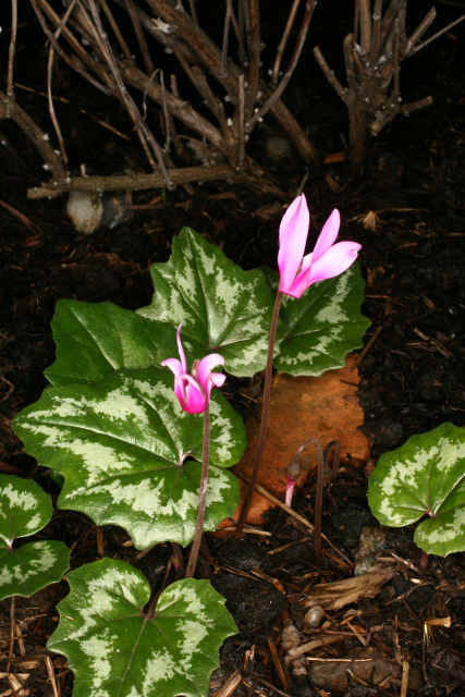 The Cyclamen genus contains 23 species. In the wild, their distribution is centred on the Mediterranean, being natives of parts of Europe, western Asia and parts of North Africa. Cyclamen are tuberous plants that have no obvious affinity with primroses (despite being in the same family). They do resemble the North American Dodecatheon in having reflexed petals. Their habitats range from beech woodland, through scrub and rocky areas, to alpine meadows where they flower in snow meltwater. The genus is notable for the fact that although it is small, there are species which flower in every month of the year.