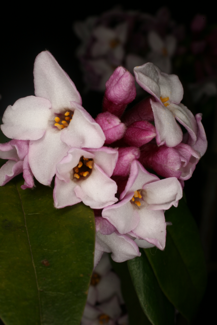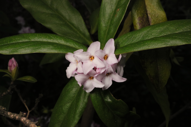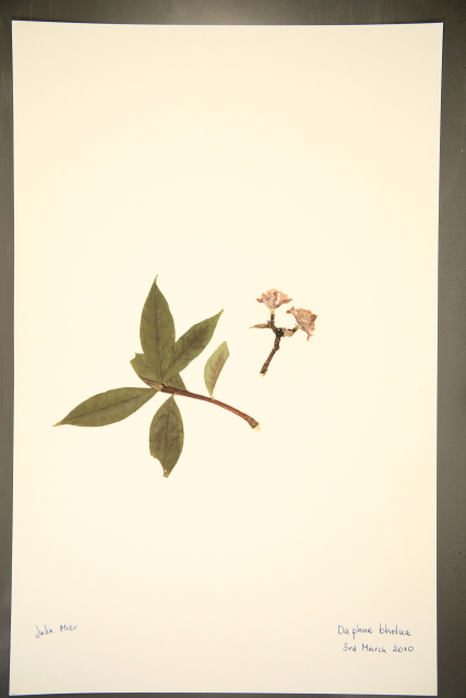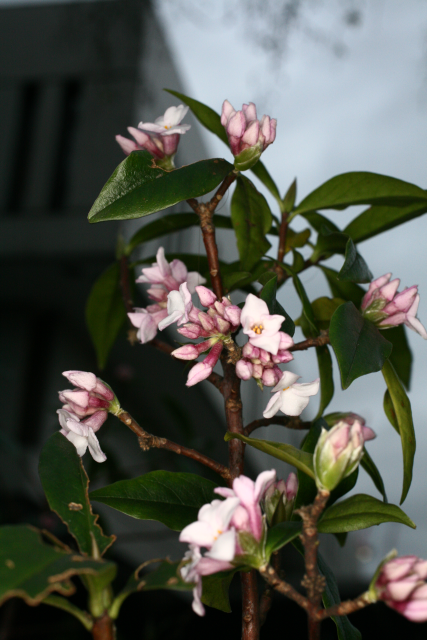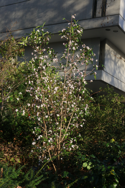 *Daphne bholua Buch.-Ham. ex D.Don Thymelaeaceae Nepalese paper plant. Daphne was the nymph turned into a laurel to avoid being chased by Apollo. Bholua probably from the Nepalese name 'baruwa'. This cultivar has the RHS Award of Garden Merit as it is floriferous and hardier than others. 'Jacqueline Postill' Distribution: Nepal to Southern China. Bark used to make paper.