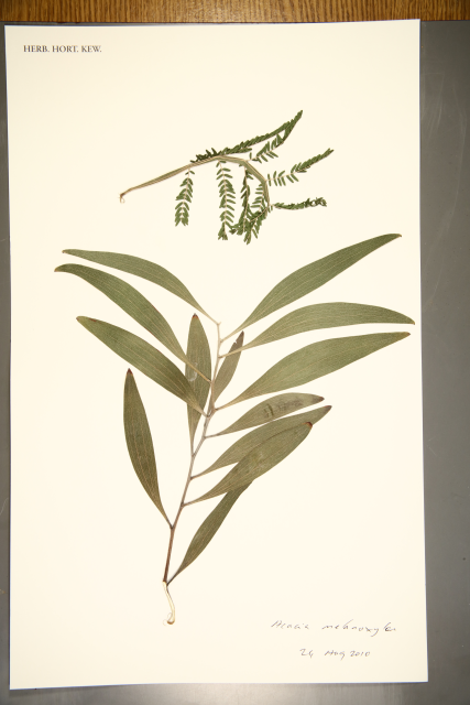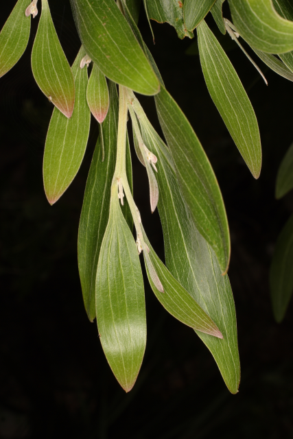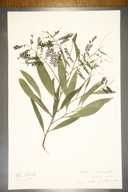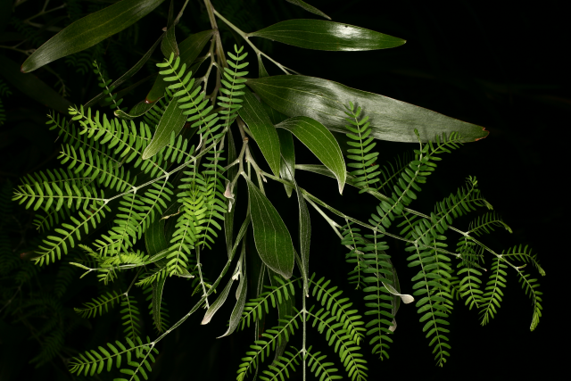 Acacia melanoxylon R.Br. Mimosaceae. Australian Blackwood. Tree. Distribution: Eastern Australia. Tree. Invasive weed in South Africa, Portugal, California. Local uses: analgesic. Causes allergic contact dermatitis due to 2,6,-dimethoxybenzoquinone. Pinnate leaves of young plant drop off and phylloclades are formed instead.