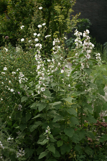 Althaea officinalis L. Malvaceae. Marsh Mallow. Herbaceous perennial. Althaea comes from the Greek word for healing; officinalis indicates that it was used in the 'offices' - the clinics - of the monks in medieval times. Distribution: Africa. The mucilage from the roots was made into confectionary called marshmallow, but no longer. It is now made of sugars, corn syrup and gelatin with various flavourings. Dioscorides (Beck, 2003) recommends it for injuries, parotid tumours, scrofula, mastitis, uterine disorders, urinary porblems, painful hips, dysentery, shakes, ruptures, toothache, vitiligo, dysentery, haemoptysis, bites and burns.