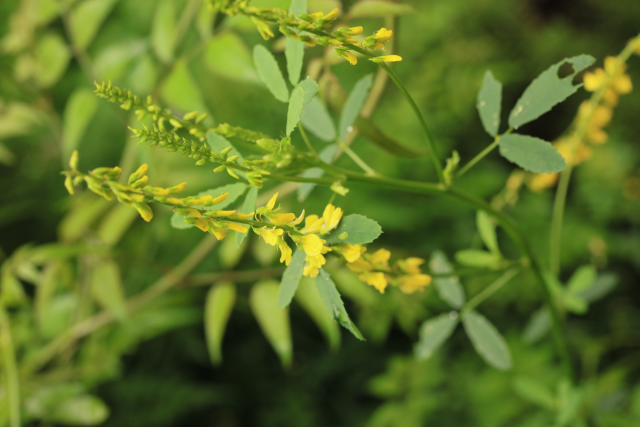 An erect, straggly, short-lived perennia or biennial, 60cm high, it has ridged, branched stems with trifoliate leaves and narrow ovate leaflets. The yellow honey-scented flowers are borne in slender axillary racemes, from mid-summer to autumn.