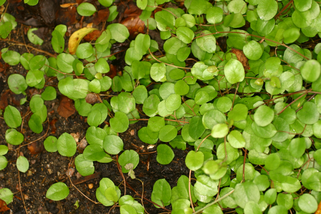 Muehlenbeckia complexa belongs to the family Polygonaceae and grows naturally in New Zealand in damp, fertile soils. In the Medicinal Garden, its creeping stems and miniature dark-green leaves make it an effective spreading ground cover in partially shaded borders. We only grow M. complexa var triloba with unusual violin-shaped leaves. It is trimmed as required to prevent it smothering neighbouring plants. Frost hardy, it benefits from an annual mulching with bark chips as protection. (Clare Beacham)