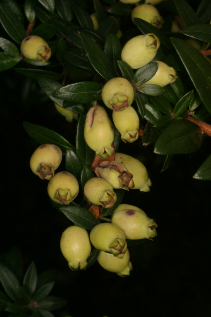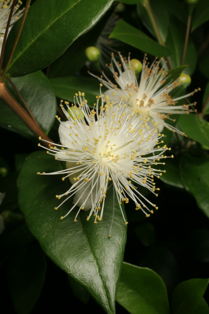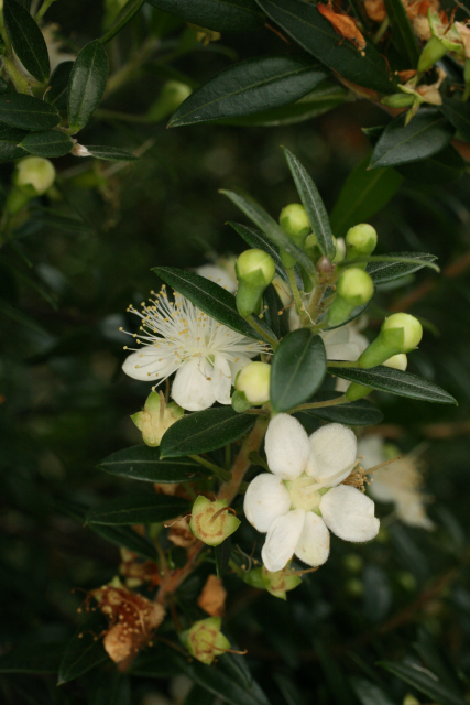 These notes refer to the species Myrtus communis L. Myrtaceae Myrtle . Distribution: Europe. Dioscorides (Beck, 2005) recommends the fruit for treating haemoptysis (‘spitting blood’) and cystitis, and, if boiled, he said it made a fine wine. In various forms it was used as a hair dye, for sore eyes, anal and uterine prolapse, dandruff and shingles, all sorts of inflammations, scorpion bites and even sweaty armpits. Our plant has white berries, but he regarded those with black berries (they become black later in the season) as being more effective. Lyte (1578) adds that the juice of the berries kept the hair black and stopped it falling out, and prevented intoxication. He notes that it only flowered in hot summers in England, but it is reliable in flower now, either due to global warming or selection of suitable clones.