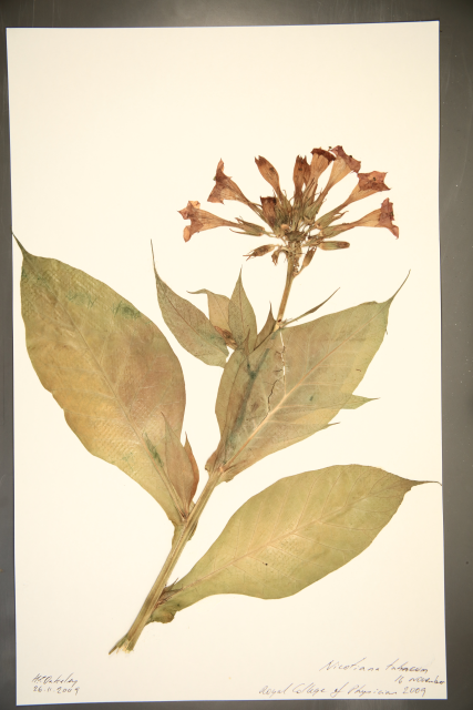 Notes by Henry Oakeley from Lindley's 'Flora Medica' (1838): The source of the tobacco used in cigarettes, Lindley has more to say about this plant than almost any other in his book. He calls it a powerful stimulant narcotic, says it is used as an enema for the treatment of strangulated hernias ‘but the remedy is dangerous’; that ‘if smoked in moderate quantities it acts as a harmless excitant and sedative, yet it is a frequent cause of paralysis when the practice is indulged in to excess’. Gardeners used to use nicotine as an insecticide, but this is now banned. Lindley notes ‘Oil of Tobacco, which is inhaled and swallowed in the process of smoking is one of the most violent of known poisons. The Hottentots are said to kill snakes by putting a drop of it on their tongues [presumably the tongue belonged to the snake], and the death of these reptiles is said to take place as instantaneously as if by an electric shock’. Doctors’ warnings about the dangers of tobacco are not a new phenomenon but now it kills more people world-wide than any other plant.