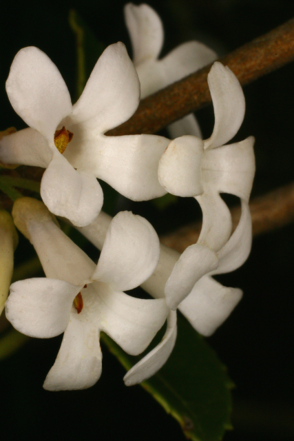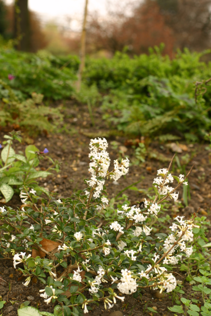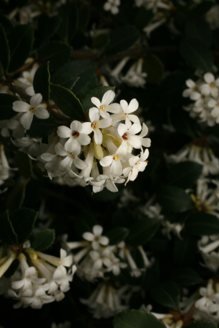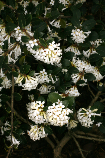 Osmanthus delavayi Franch. Oleaceae Evergreen shrub. Distribution: China. Osmanthus is derived from the Greek for 'fragrant flower', delavayi from its discoverer, the French Missionary with the Missions Étrangères, and plant collector, Pierre Delavay (1834-1895). He sent 200,000 herbarium specimens containing 4000 species including 1,500 new species to Franchet at the Museum of Natural History in Paris. He sent seed of O. delavayi to France (1886), but only one germinated, and all the plants in cultivation until it was recollected 40 years later, arose from this plant (Bretschneider, 1896). The flowers are used to make a tea in China, but the berries (drupes) are not regarded as edible.