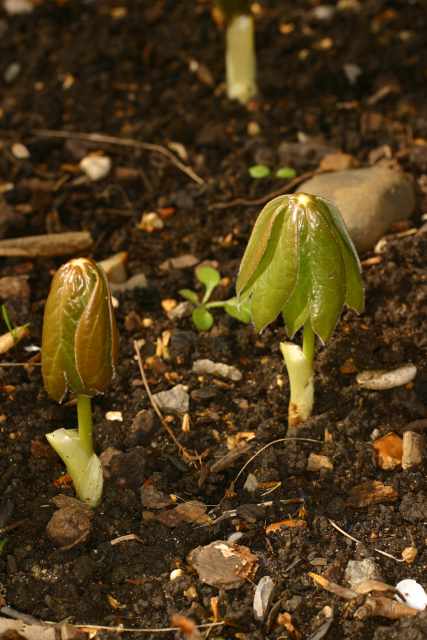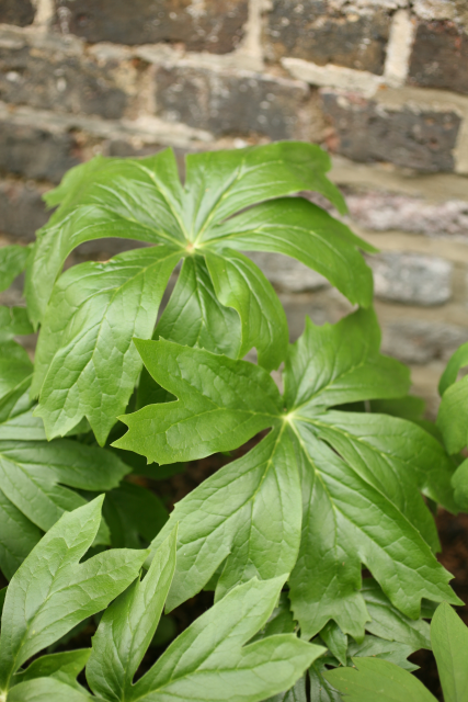 Notes by Henry Oakeley from Lindley's 'Flora Medica' (1838): The ‘May Apple’ of the United States (where it is also called ‘Mandrake’ though that name is usually used for Mandragora officinalis of Europe) is to be found coming into leaf in April, and into flower in May, in the North American beds to the right of the exit from the College car park. Lindley describes the rhizome as being a ‘very sure and active cathartic [a purgative]’, but that the leaves are poisonous and the whole plant narcotic. He makes no note of its topical use in treating venereal warts for which it is used in modern medicine as podophyllum and podophyllotoxin (see British National Formulary), extracted from the rhizome. Even when applied topically, care must be taken as it is absorbed readily and can produce toxic side effects.