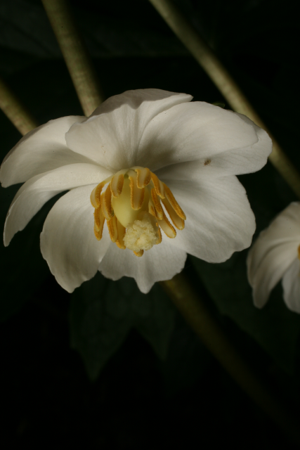 This North American plant has pretty fl owers followed by little berries hiding under its leaves. Lindley describes the rhizome as being a ‘very sure and active cathartic [a purgative]’, but that the leaves are poisonous and the whole plant narcotic. Austin reports that the ripe fruits were eaten by the Cherokee, Ojibwa, Iroquis and others, but that the roots are highly poisonous and were eaten to commit suicide, and in smaller doses as a purgative. Extracts from the roots were used by the Cherokee to treat intestinal worms – in a dose which was more poisonous to the latter than the patient. The Menomini used it as an insecticide and the Penobscot to cure warts. It is reported erroneously that this latter cytotoxic action was noted by Robert Bentley in 1861 at King’s College and a poultice from the roots was, for a while, used to treat cancers that had broken through the skin, however the plant so noted by Bentley was Sanguinaria canadensis. An extract of the roots, podophyllin, is still used to treat venereal warts, and the semi-synthetic derivatives etoposide and teniposide, valuable treatments for various cancers, have been produced from it.